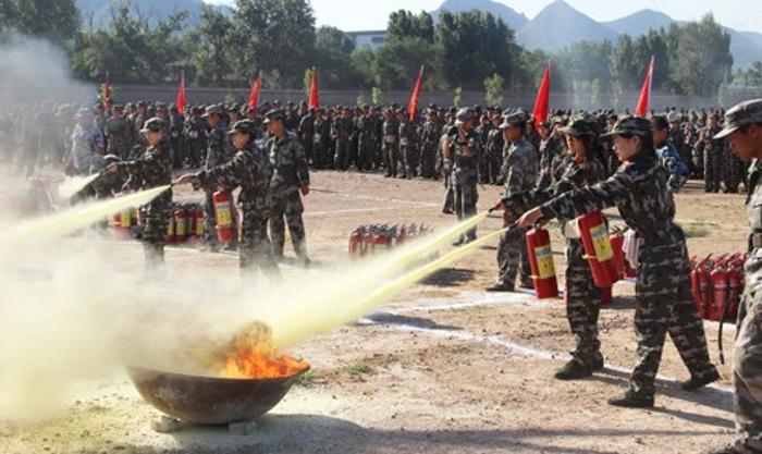 2014年7月15日上午,随着军训团总指挥闫勇的一声令下,2013级学生消防演习正式开始。