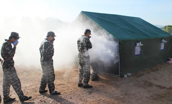 在演习场地的另一侧,同学们以连为单位,按照火场逃生的要求,用毛巾捂住口鼻,依次通过了浓烟滚滚的模拟火灾现场。